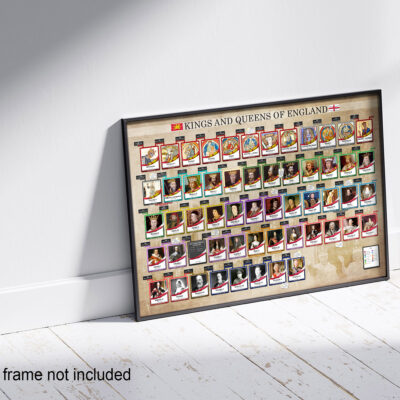 The definitive poster print detailing all of the English monarchs from King Athelstan to King Charles III.