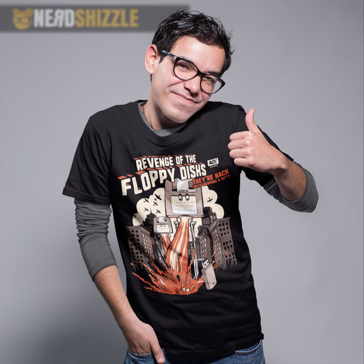 The Floppy Disks are back… with weapons and sh*t!! This original NerdShizzle design is perfect for computer and techy nerds – especially ones old enough to remember transporting important files using the archaic floppy disk! This busy comic design is one of our absolute favorites and we always circle back to it when asked what we love to wear ourselves. It’s a bit of a random design, but let’s be honest, so are we. And if you are too, and you love a bit of retro tech mashed with some retro comic, then this might be the choice for you.