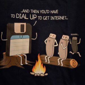 This original Nerdshizzle design is definitely one of our favourites and our customers have given us some great feedback, offering that humorous take on techy nostalgia. It remains one of our most popular designs and was the inspiration to some of our other designs including “Campfire Tales of Retro Phones” and “Campfire Tales of Mix Tapes“.