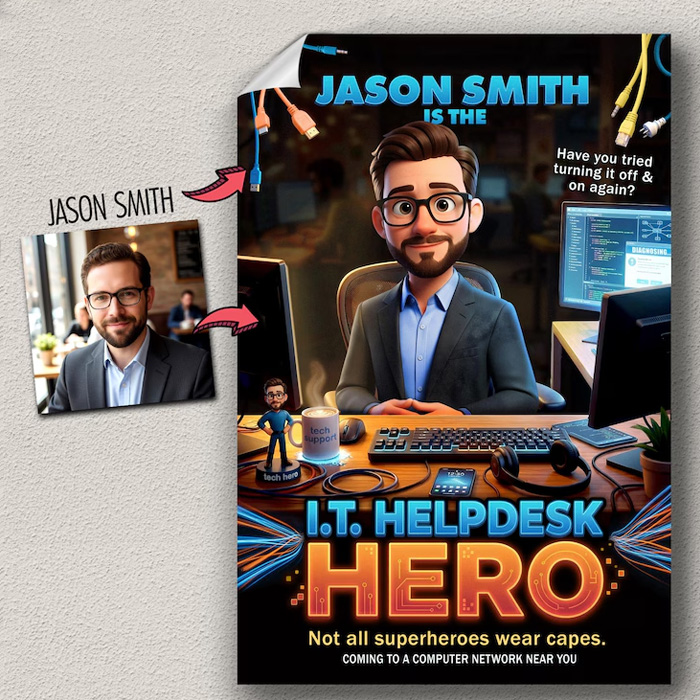 Tired of being the unsung hero? Not anymore! Turn yourself into a Pixar-powered Tech Support Superstar. Step into the spotlight as the ultimate Tech Support Legend! Upload your photo, get that perfect Pixar-style hero glow-up, add your name, and star in your own blockbuster poster. Hang it in the helpdesk, office, or home setup – because every reboot warrior deserves cinematic glory! Also a perfect custom gift idea for your own go-to tech support hero!