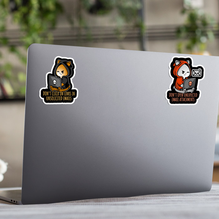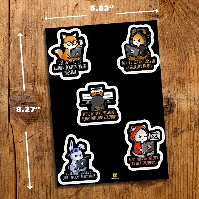 A set of five cute cybersecurity awareness stickers that are perfect for anyone that works in the field of cyber security. Each sticker features a simple piece of cyber advice such as using two factor authentication, not clicking on email links or opening email attachment, using strong passwords and not reusing passwords. A cute way to adorn any laptop (or most flat surfaces). Spread the love and the cyber safety tips with this sticker pack that is available from our Etsy store.
