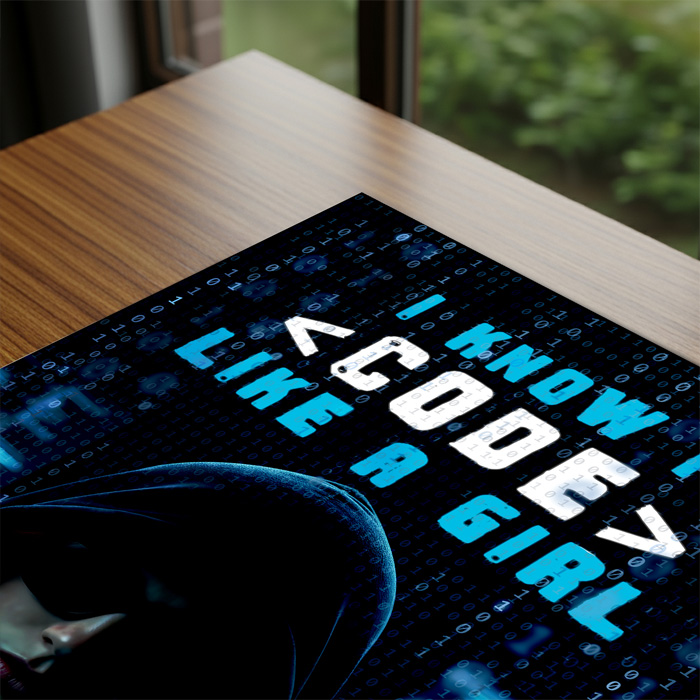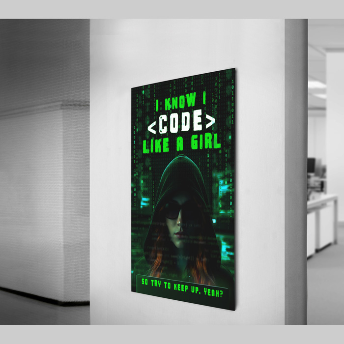 Perfect for all those female coders out there, this standout design is a perfect way to adorn your workspace. Part of our “women in IT” range, this print has a cool binary background along with the text “I know I <code> like a girl… so try to keep up, yeah?”