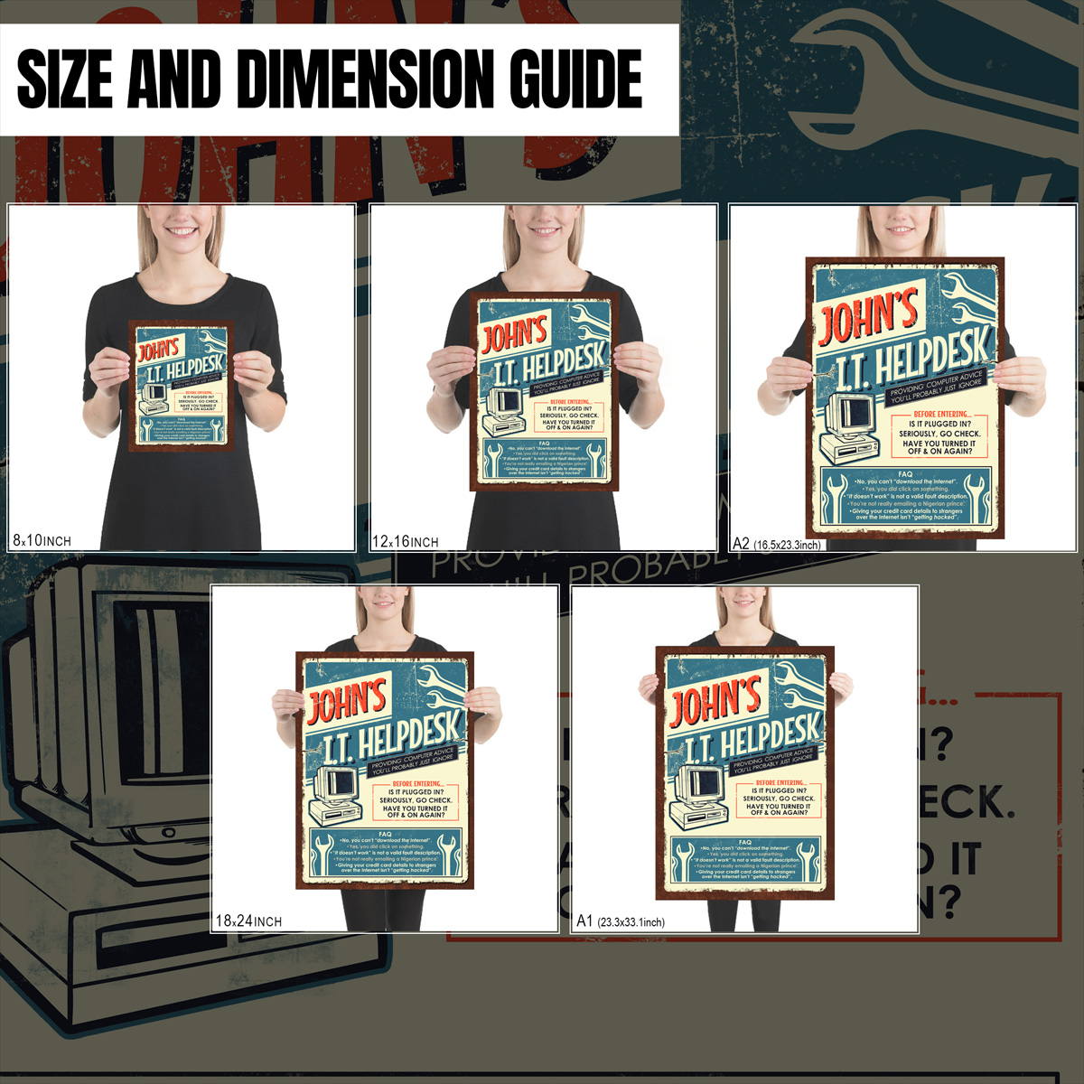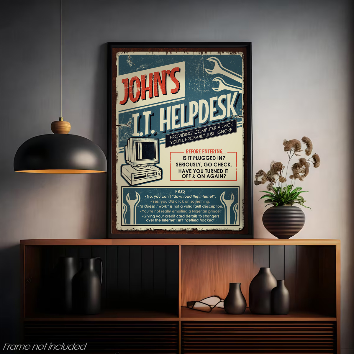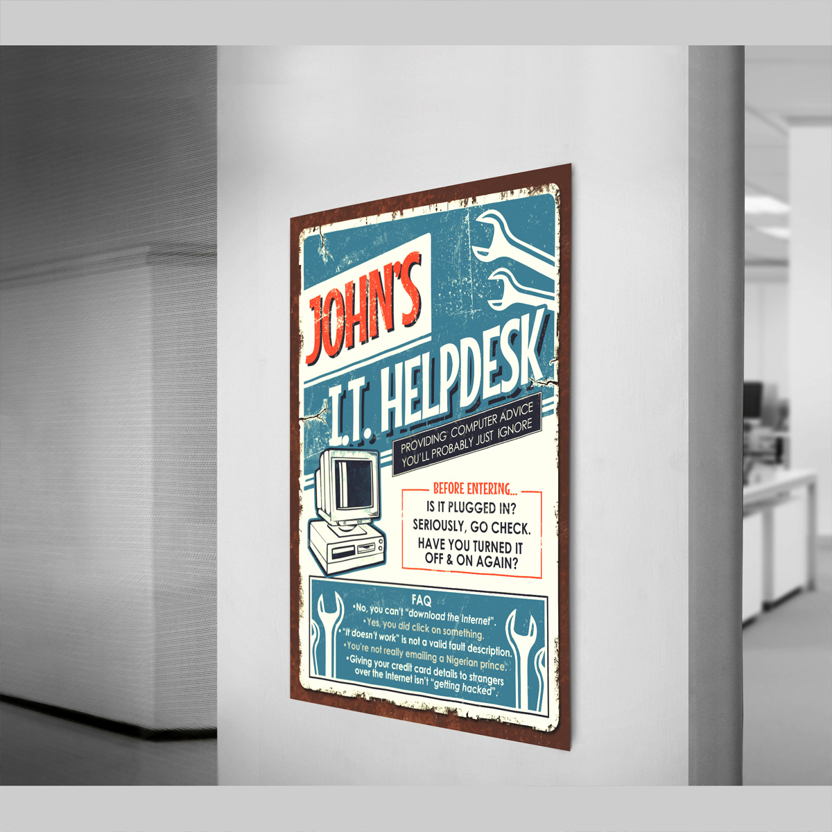 Our retro themed IT Helpdesk poster print has proven to be a firm favourite with our customers (see selection of reviews below). In fact it’s consistently one of our bestsellers on our Etsy store. Perfect for any IT department or cyber workspace, this vintage looking print allows you to personalize it with your (or the recipient’s) name for a personalized touch. Packed with I.T. insider jokes and following the theme of exasperated tech support staff, this print is both relatable and relevant. Ideal for the cybersecurity pro, the tech support guru, or just that person who everyone goes to when in need of technical assistance.