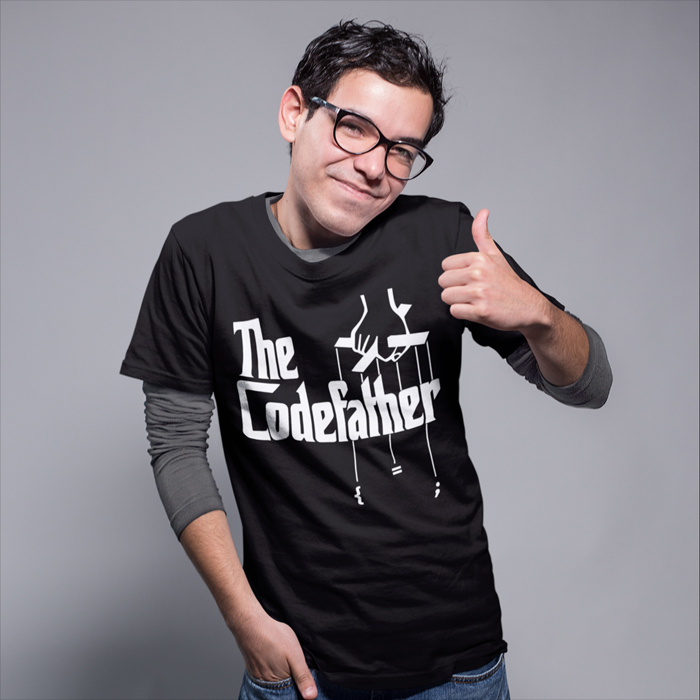 Meet the Codefather — the ultimate black t-shirt for software developers who run the codebase like a family empire. Bold, clean, and dripping with mafia swagger, this premium black tee declares you as the undisputed boss of bugs, refactors, and legacy systems. Choose the classic ‘The Codefather’ design or personalize it with your name — ‘[Name] is the Codefather’ — and watch your team start kissing the ring (and cleaning up their commits). Made for senior devs, architects, and anyone tired of spaghetti code, this shirt is an offer your wardrobe can’t refuse. Wear it loud, code it clean, and rule the sprint like a true Don.