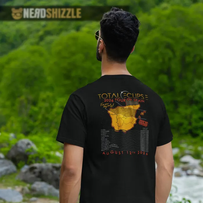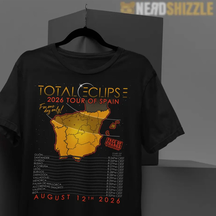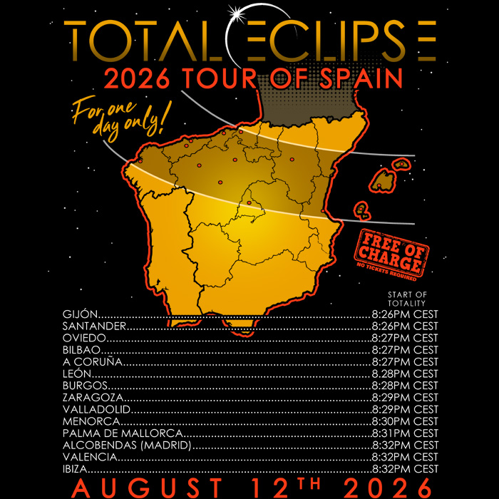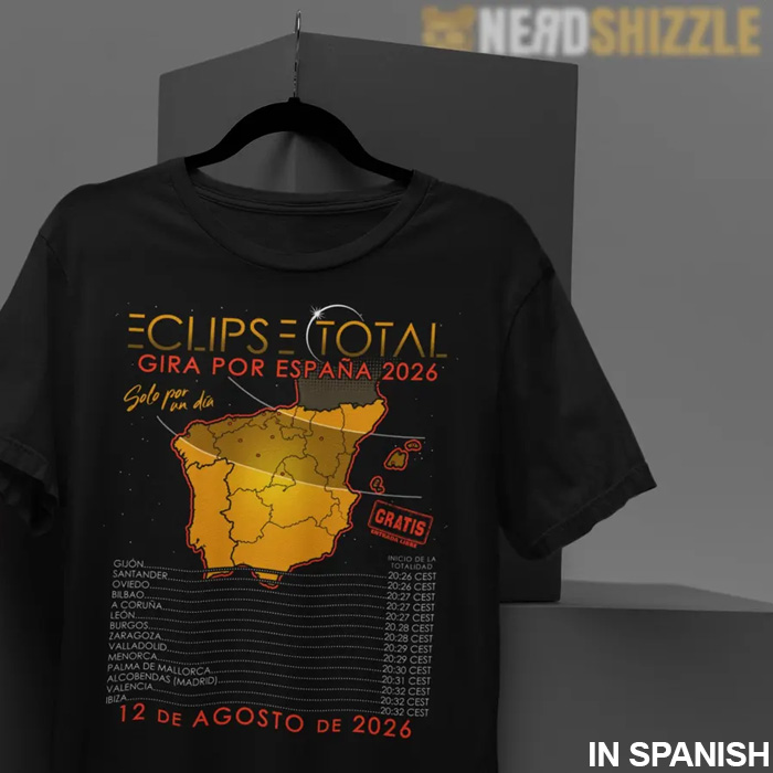 Concert-style tee featuring the Moon’s shadow tour route across Spain on August 12, 2026. Comfy cotton, bold map design – your ticket to the eclipse of the century without leaving home (or wear it there!). Perfect for any eclipse chaser watching this rare ceslestial event in Spain or the balearic islands. This design is available in either English or Spanish and can be printed on the front or reverse of the t-shirt (with the other side left blank). It’s available from our Etsy shop!